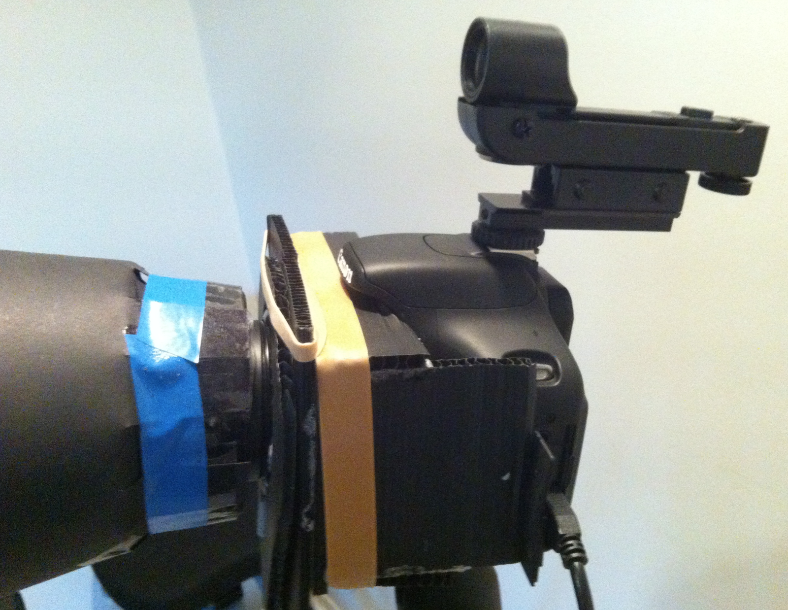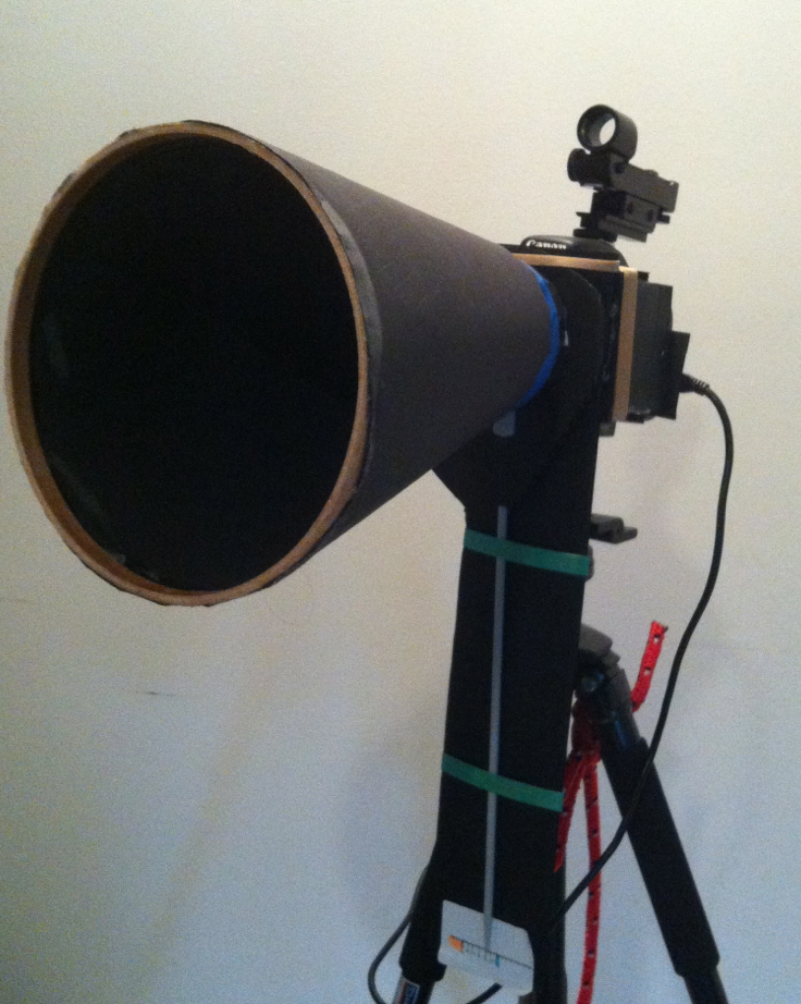 The Canon provides the option of using Liveview and Nebulosity provides the option of “Fine Focus” which generates a number based on the intensity of a targeted star. Focus is when you max the number. This is the option I did best with, possibly because it is based on a number instead of my eyesight. However, my manual dexterity was also at fault so I invested in some cardboard and a knitting needle. Add to that my cardboard dew protector and a telrad finder in the camera hotshoe and I was ready to have another attempt, just as soon as it stopped raining again.