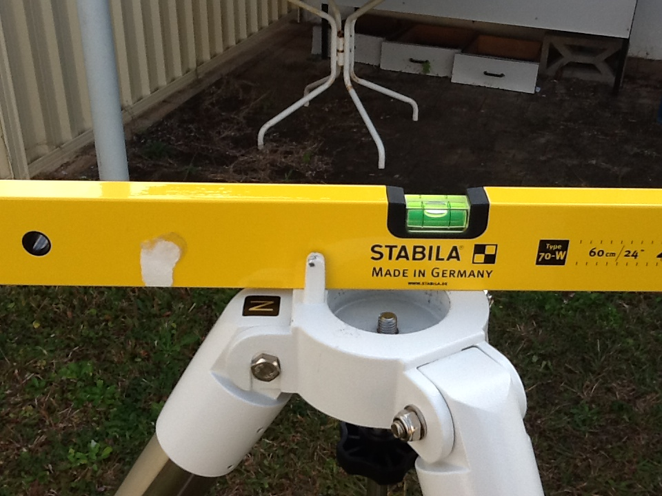 For the initial physical setup, I have made no use of the polar scope system. Instead, I level the tripod carefully and point the tripod leg labelled “N” to True South with some care as well. The altitude is set at the value of the latitude. After that, I go directly to drift alignment in 2 axes, adjusting the RA and Dec adjustment knobs as required (details below).