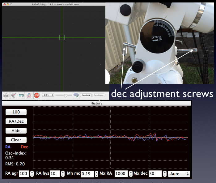 As before, it is the red line labelled “Dec” which will drift but this time, it is the Dec knobs which are adjusted to correct the drift. Stop guiding, adjust Dec knobs, restart guiding and check drift again. Once there guider has control without drift, the scope is aligned.