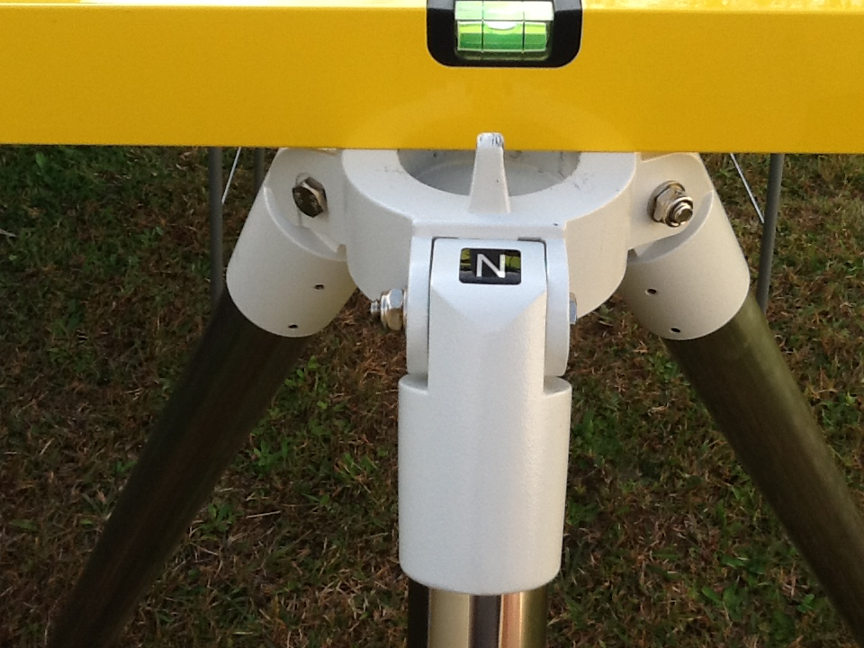 1. Point the “N” of the tripod to true south using a compass and level the tripod. The N-S alignment is only approximate at this stage and is made more accurate later by the RA phase of the drift alignment using the RA adjustment screws.