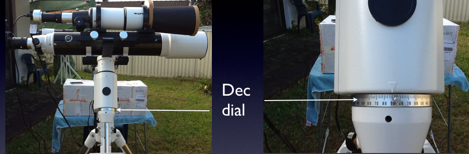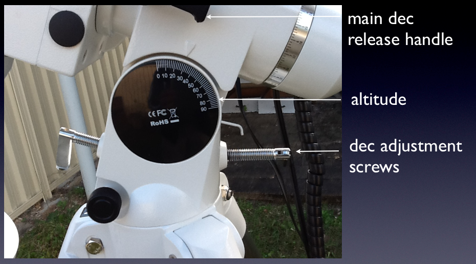 2. Fully assemble with the scope pointed at the south celestial pole by setting the altitude to the current latitude using the main Dec release handle. This altitude/latitude (Dec) setting is only approximate at this stage and is made more accurate in the Dec phase of the drift alignment using the Dec adjustment screws.