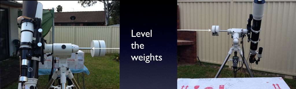 Next, drive the scope in RA to level the weights. The scope should now be pointed at the intersection of the celestial equator and the meridian, in which position, the error in the RA (N-S alignment) can be addressed.