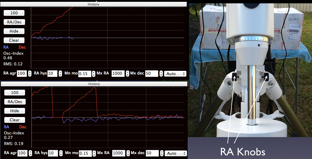 In the Graph mode of PHD Guiding, the red line labelled “Dec” will drift but it is the RA knobs which are adjusted to correct the drift. Stop guiding, adjust the RA knobs, restart guiding and check drift again .. until it ceases to drift. Drifting up meant loosening the left knob when standing south facing north … but basically, if it drifts faster, you are going the wrong way Smilie: :)